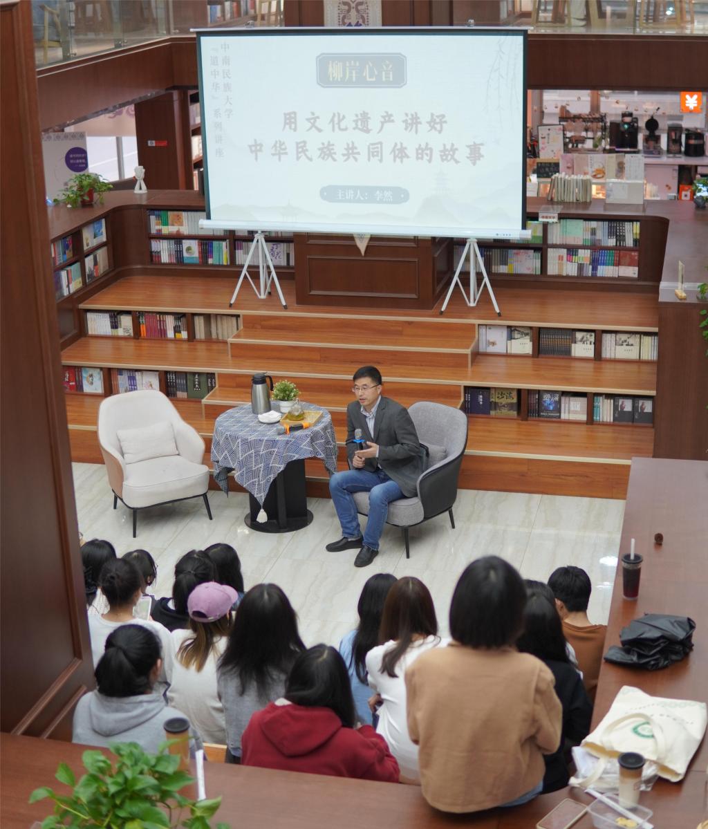 4月2日下午,必赢官网“柳岸心音”线下沙龙之“道中华”系列讲座第一讲在图书馆倍阅书店开讲,民社学院李然教授带来题为《用文化遗产讲好中华民族共同体的故事》的讲座,大学生记者团成员现场参加。讲座由文学与新闻传播学院2021级学生黄琪祁主持。