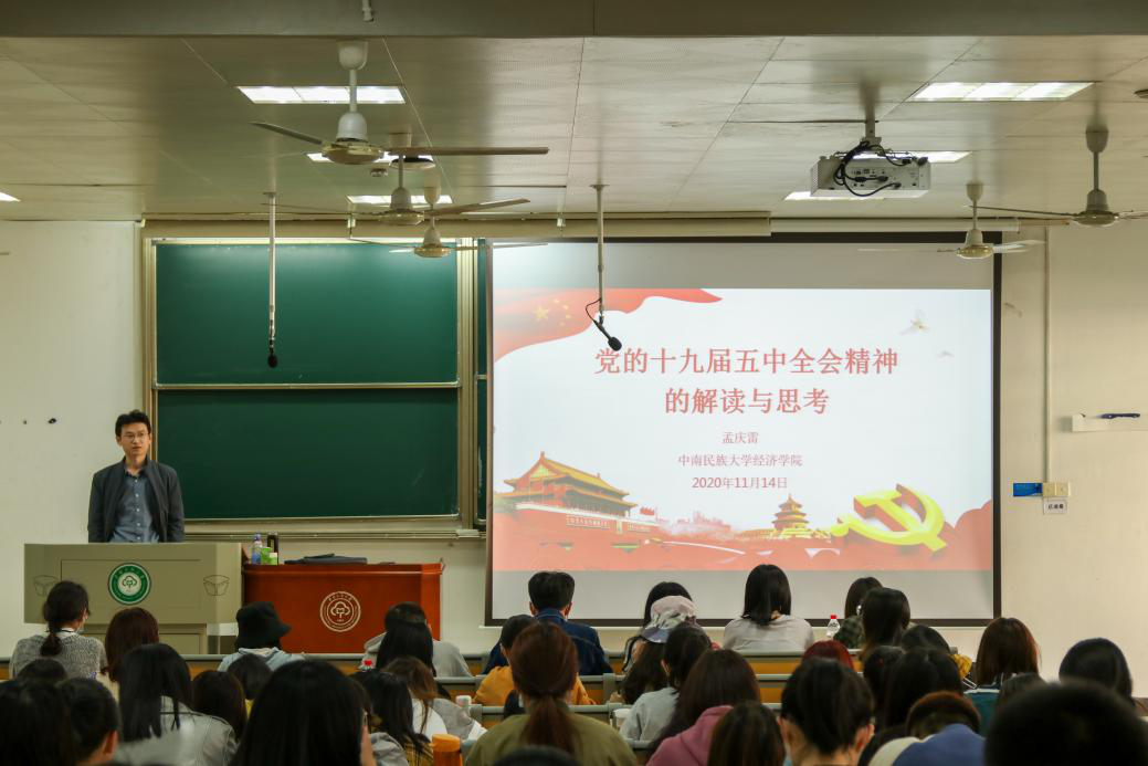 随后经济学院副院长孟庆雷对党的第十九届五中全会做出深入解读。他认为在我国即将实现第一个百年奋斗目标,开启全面建设社会主义现代化国家新征程的当下,五中全会的召开是一次具有全局性、历史性意义的重大事件。他要求全体学员必须坚持党的全面领导,紧密团结在以习近平同志为核心的党中央周围,同心同德,顽强奋斗,夺取全面建设社会主义现代化国家新胜利。