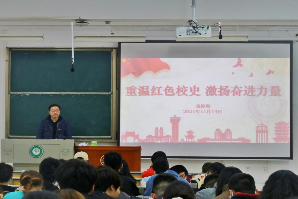 学工部副部长邓俊熙以《重温红色校史 激扬奋进力量》为题,从学校建校的前身与发展的历史、校名由来的故事和知名校友的人物事迹三个方面为学员们介绍和解读了学校七十年的红色校史。他通过回顾学校三次转型、四次更名的历史轨迹,带领学员们感受学校育人报国的奋斗历程,要求学员们重温和铭记光荣的红色校史,在党史校史的学习中汲取红色智慧,提高自我修养,练就过硬本领,传承民大人一脉相承的奋斗精神,为国家与社会的发展作出贡献。