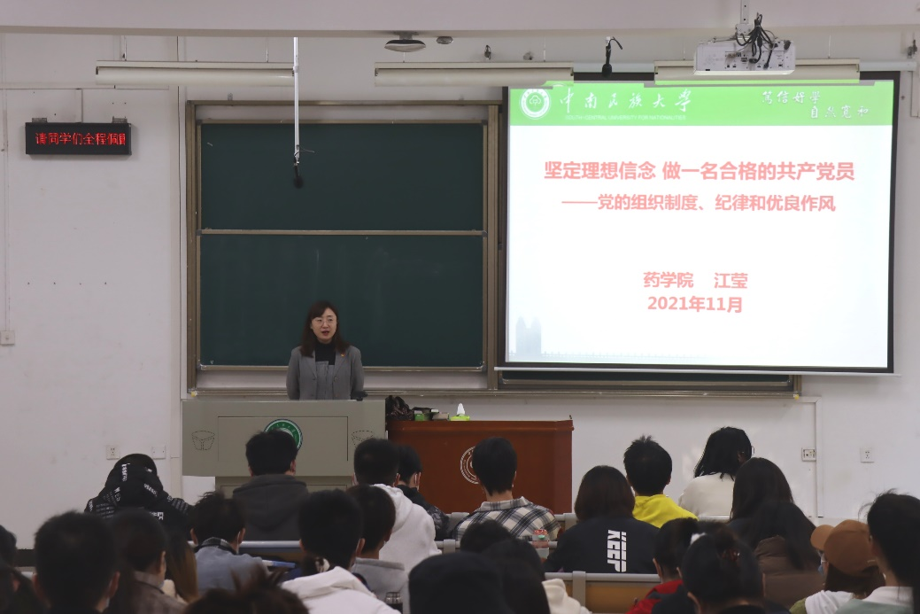 药学院党委书记江莹以《坚定理想信念 做一名合格的共产党员——党的组织制度、纪律和优良作风》为题展开培训班第一讲。她详细解读了党的组织制度,强调了党的纪律和作风,希望学员们认真学习党的规章制度,保持理论联系现实、密切联系群众、批评与自我批评三大优良作风,在思想认识上成为先锋,在学习实践中成为标兵,在道德修养上成为楷模, 做到学和用、知和行的统一。