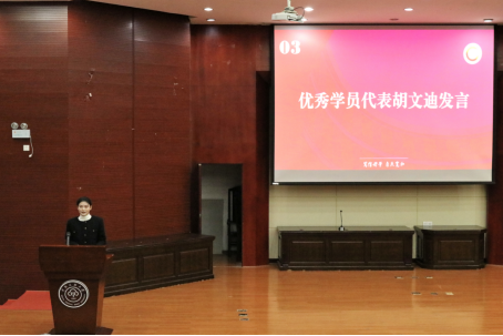 优秀学员代表胡文迪同学代表全体党校学员,向提供宝贵学习和实践机会的党组织致以最诚挚的感谢,并表示将充分利用在培训班的收获,锤炼品格、脚踏实地,强化理论武装,筑牢理想信念,早日成为符合时代发展和社会需要的优秀党员。