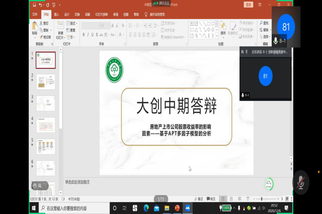 本站讯(记者:滕柳彤)为强化学生创新创业能力,检验各团队项目进展,12月6日晚,经济学院于线上举行2020年大学生创新创业训练计划中期检查答辩。共10支队伍参与本次线上答辩。学院副院长熊芳、教师陈全功、王小君、甘天琦、学院团委书记高无尽等担任评委。