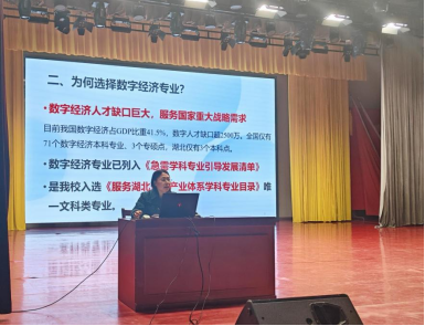 数字经济教研室刘驰老师以“数字新时代”为切入点,从数字经济是什么、为什么要学数字经济、如何学数字经济三个方面开展专业推介,并通过数字经济的应用案例,为学生生动诠释了新时代数字经济专业的广阔应用前景。