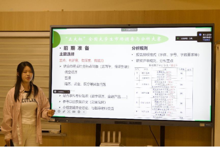 谷源围绕“正大杯”全国大学生市场调查与分析大赛展开分享。她认为,竞赛前期的主题选择要“新”意十足、“深”入挖掘,要结合当下热点与专业知识。在实证分析时,不能舍本逐末追求模型的华丽,而要注重实际应用,让分析结果真正“落地”,从而提出切实可行的建议。