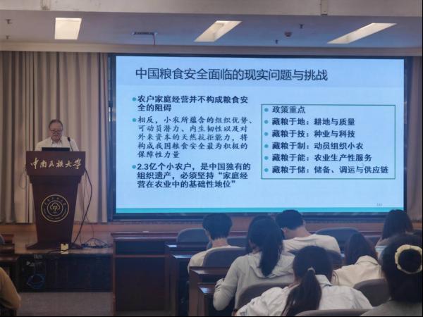 王雅鹏教授从什么是粮食安全及其被重视的起因?新时期中国的粮食安全战略与成就、中国粮食安全面临的现实问题与挑战、中国粮食安全的政策建议及策略和中国粮食安全的热点问题讨论等五个方面进行了专题报告。关于什么是粮食安全及其被重视的起因?他从多视角对粮食安全的概念进行了阐述,并对粮食安全被重视的原因进行了追溯。关于新时期中国的粮食安全战略与成就,他指出党的十八大以来,以习近平同志为核心的党中央高度重视国家粮食安全,始终把解决好十几亿人口的吃饭问题,作为治国理政的头等大事,目前我国粮食安全整体趋势向好;关于中国粮食安全面临的现实问题与挑战,他从耕地“非农化”、“非粮化”,政府抓粮、农民种粮积极性减弱,以及全球主要粮食价格供求形势转紧等方面进行了阐述;关于中国粮食安全的政策建议及策略,他指出在粮食安全问题上,必须要居安思危,增强忧患意识,要落实耕地责任保护制度,构建大食物观统筹下的耕地保护协同治理体系,以提高粮食的国际竞争力;关于中国粮食安全的热点问题讨论,围绕转基因技术与粮食安全、低碳经济与粮食安全这两个热点问题进行了分析,他认为转基因技术及其品种在粮食生产中的应用将会成为历史的必然,要积极推行“粮食生产低碳化”,推进低碳经济与粮食安全协调发展。