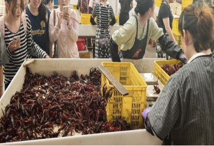 潜江小龙虾交易中心有“中国虾谷”之称,是全球最大的小龙虾集散中心,这里有供应链平台,提供撮合交易、仓储物流、金融贷款等服务。在交易市场车间,师生目睹分拣、置冰、打包、发货快速流程,操作人员在3秒内精准识别小龙虾的大小、色泽与鲜活度,日均处理量超300吨。