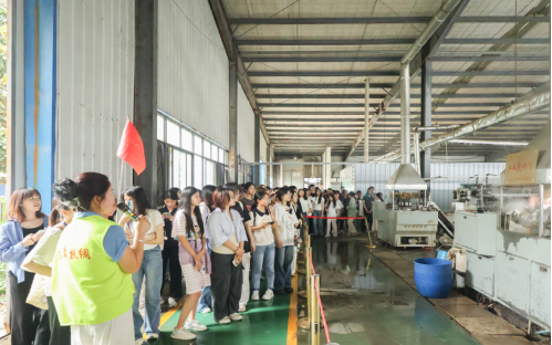 在桑蚕丝绸工业生产区,师生近距离观察蚕茧处理、生丝加工到成品制造的完整环节。传统丝绸工艺与现代环保技术融合而成的全链条绿色生产体系,生动展现传统产业向“绿色文创”转型的特色路径。