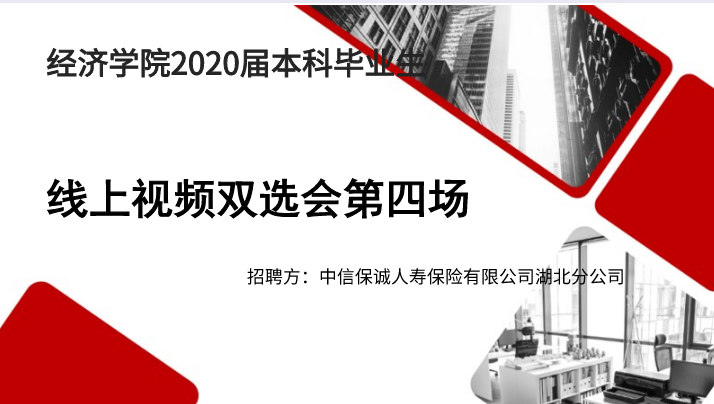 本站讯(记者:郝振兴)为持续推进毕业生就业工作,进一步拓宽就业渠道,5月8日上午,经济学院通过腾讯会议举办2020届本科毕业生第四场线上双选会。此次会议由中信保诚人寿保险有限公司湖北省分公司业务经理陈薇、郑东主讲,风险管理与保险学系主任鲍金红教授、毕业班辅导员徐莹、杜光耀以及经济学院2016级本科毕业生参加会议,学院党委副书记李忠贤主持会议。