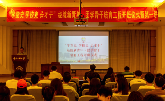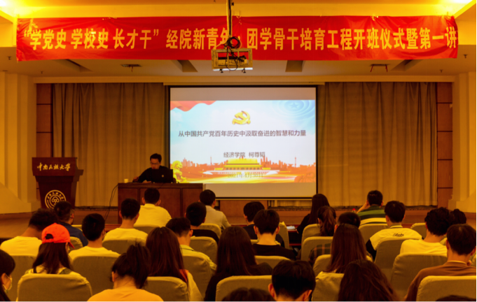 本站讯(记者:姜权卿)为提升团学骨干的工作能力和服务水平,4月30日晚,经济学院在润良报告厅举行“学党史 学校史 长才干”经院新青年•团学骨干培育工程开班仪式暨第一讲。经济学院党委书记柯尊韬、党委副书记刘君强和2019级辅导员熊岳炜、2020级辅导员徐莹、阿禾朱力·黑沙参加会议,经济学院第二十四届团委学生会主席团、全体干部、干事,学院2020级年级学生会全体成员,2019级本科学生党支部党员及发展对象,2019和2020级各班班长、团支书到场学习。会议由刘君强主持。