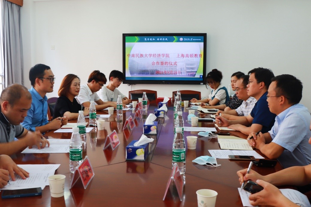 (本站讯:姜权卿)为加强院企合作,促进协同育人,提高人才培养质量,9月24日下午,经济学院与上海高顿教育举行合作签约仪式。上海高顿教育武汉分公司总经理吴月明、高顿考研武汉分校校长陈娜一行6人,经济学院党委书记柯尊韬、党委副书记、院长李波、党委副书记刘君强等人出席签约仪式。仪式由刘君强主持。