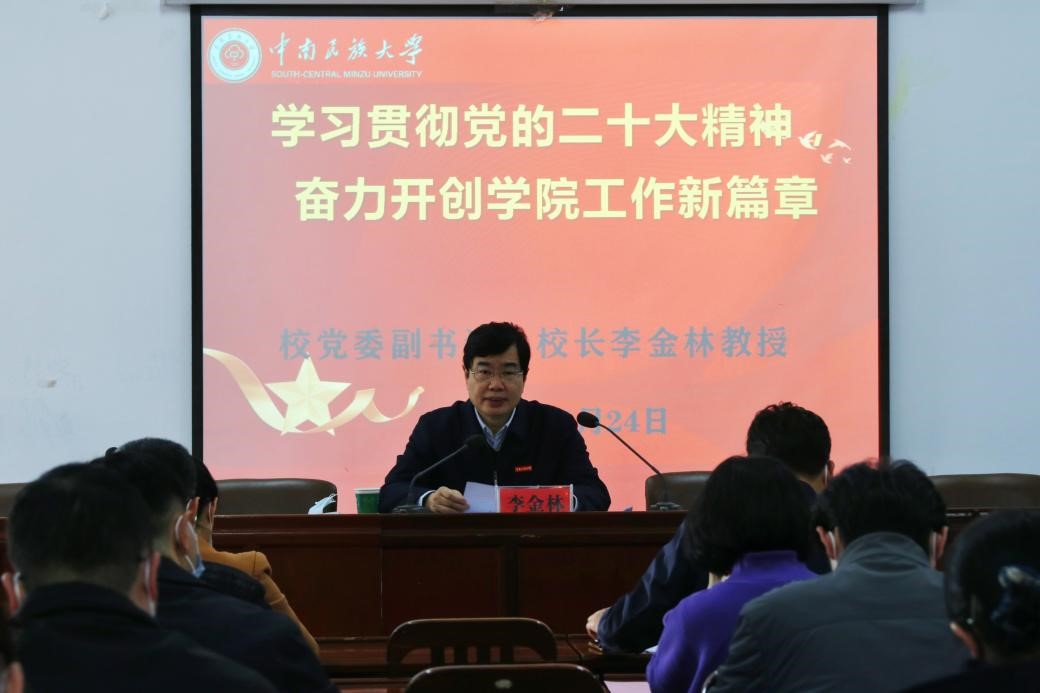 11月24日下午,校党委副书记、校长李金林到经济学院和资源与环境学院宣讲党的二十大精神,两个学院的领导班子成员、师生党支部书记、本科生和研究生辅导员、办公室干部和学生代表参加宣讲会。