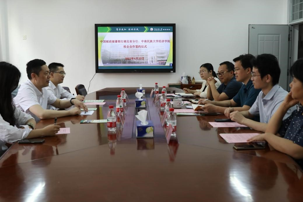为推动产教融合协同育人,提高人才培养质量,4月20日下午,经济学院与中国邮政储蓄银行湖北省分行于15号教学楼1023会议室开展了校企合作签约座谈会。中国邮政储蓄银行湖北省分行人力资源部总经理欧洪涛、副总经理汤剑波、招聘管理员工袁白沙及经济学院党委书记柯尊韬、党委副书记刘君强、副院长孟庆雷、国际经济与贸易教研室主任张娟、国际经济与贸易支部委员揭子平参加此次会议。会议由张娟主持。