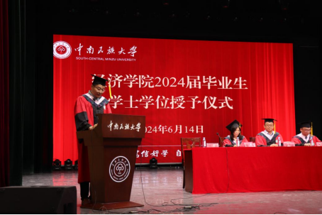 毕业典礼和学位授予仪式在庄严的国歌声中拉开帷幕。经济学院党委副书记、院长李波教授在致辞中对2024届毕业生致以热烈祝贺,向支持学院工作的学生家长致以崇高的敬意和诚挚的问候,在学院建院40周年之际,他结合“笃学致知,经世济民”的院训和精神内核,提出在读万卷书中涵养腹有诗书气自华的人文底蕴、在行万里路中树立先天下之忧而忧的价值导向、在阅万般事中深化世事洞明皆学问的处世之道三点建议。他鼓励毕业生们肩负起新时代的重任,以铸牢中华民族共同体意识为主线,以青春之名,赴时代之约,与祖国同行,为人民奉献,让青春在奔赴祖国大好河山、以中国式现代化推动中华民族伟大复兴的征程中绽放绚丽之花。