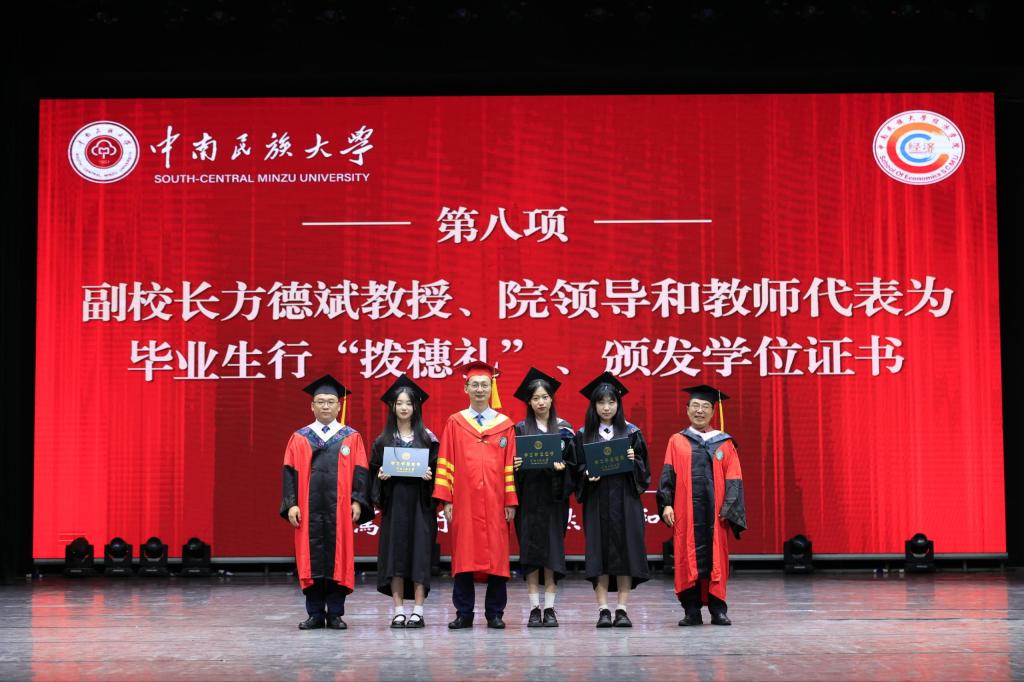 经济学院副院长熊芳教授宣读了聘任2024届毕业生“年级校友理事”“校友联络员”的决定,副院长毛中明教授宣读了学士学位授予决定。随后,副校长方德斌教授、院领导和教师代表为毕业生们颁发学位证书,并一一正冠拨穗,合影留念。