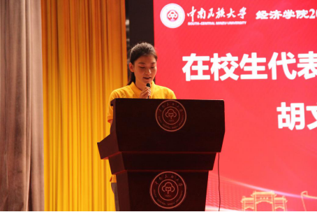 教师代表、二级教授李忠斌从经济学与生活的联系出发,勉励新生们以“笃学致知,经世济民”的理念加强学习,不断积累为党和国家奋斗的力量;在校生代表胡文迪从日常学习生活点滴出发,鼓励大家持之以恒的努力,把握好人生方向;研究生新生代表邓鸿程为新生们分享了在支教阶段的经验,并倡议大家不断巩固专业知识,以批判性的思维提出创造性的研究观点;本科生新生代表郑良宇表达了对未来学习生活的美好期盼,表示将与广大新生同学一道携手并进,共同进步。