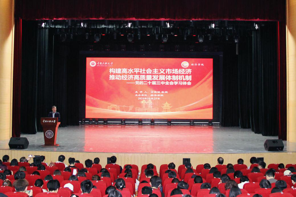 为深入学习和贯彻党的二十届三中全会精神, 10月25日下午,经济学院在大礼堂举办专题党课。校党委常委、副校长方德斌教授以“构建高水平社会主义市场经济,推动经济高质量发展体制机制—党的二十届三中全会学习体会”为题做了辅导报告,教职工代表、本硕学生代表近700人参加了学习。会议由学院党委书记戴迎峰主持。