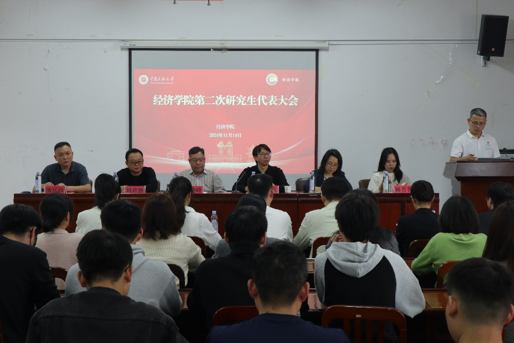为持续加强和改进研究生团学组织建设,11月14日下午,经济学院在15号教学楼1006会议室召开第二次研究生代表大会。经济学院党委书记戴迎峰,校团委副书记黄嵩,经济学院党委副书记刘君强、副院长毛中明、团委书记安树庭、团委副书记熊岳炜,校研究生会主席团成员顾菁菁及各年级研究生代表参加会议。会议由安树庭主持。