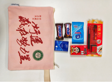 随后,与会领导和辅导员、班导师走到学生面前,为学生送上考研大礼包。礼包包括考试文具套装、纸巾、湿巾、士力架等物资,现场洋溢着温暖的笑容和愉悦的笑声。