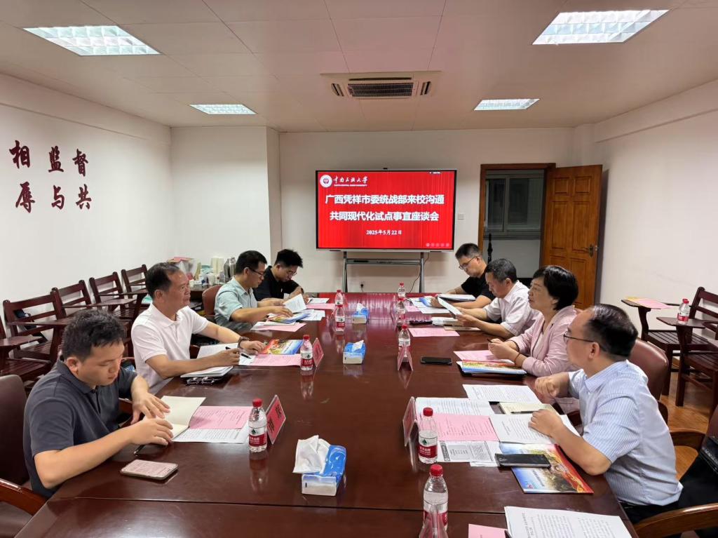 5月22日至23日,广西凭祥市委常委、统战部部长赵世文、副部长黄文海一行4人到访必赢国际437官网,围绕“共同现代化试点城市”建设开展校地合作交流。双方通过座谈研讨、实地调研等形式,共商合作路径,共谋发展新局。座谈会由校党委常委、统战部部长蔡琼主持。