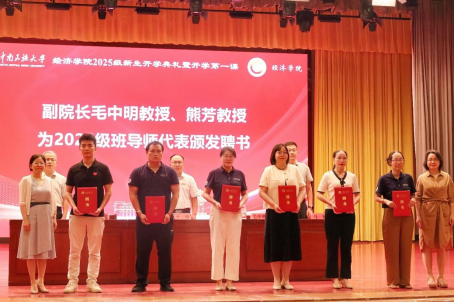 马楠宣读了经济学院2025级班导师名单,毛中明、熊芳为2025级班导师代表颁发聘书,并强调班导师要充分发挥思想引领、学业指导和成长规划的重要作用,助力新生扣好大学“第一粒扣子”。