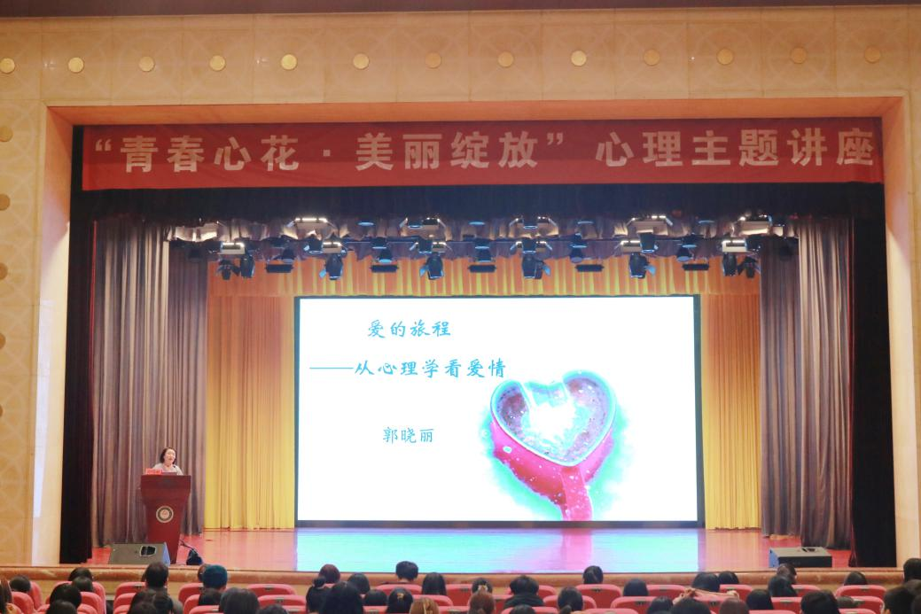 郭晓丽以《青春心花,美丽绽放》为题,从爱情的本质、对爱情的判断与理解和处理不同方面的感情问题等多个角度深入分析了大学生恋爱问题。她以自己与爱人生活上相互理解的故事和多年处理学生心理健康问题的经验,生动全面地为同学们讲解了大学生应当如何选择交往对象、如何建立正确的恋爱关系、如何处理情感问题等与同学们生活息息相关的问题。她建议同学们在与恋人的认识交往中遵循人际吸引原则,展现自己的精神品质和道德修养,给对方留下良好的第一印象,与异性产生互惠式好感;在交往中学会相互尊重,设身处地为彼此着想,建立一段长久而稳定的恋爱关系。