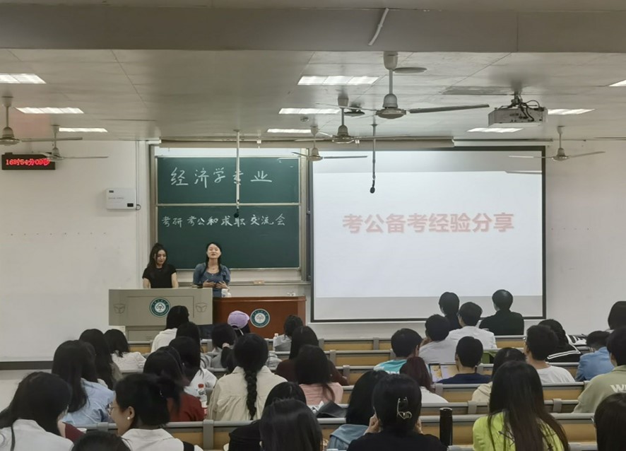 5月24日下午,为向同学们提供更加实用的考研、考公和求职的信息与经验,同时为正在考研、考公的和求职的同学解疑答惑,经济学教研室主任马宏教授和任课老师胡卫东副教授邀请唐苗苗、黄嘉琪、杜福银、赵以英和帕尔合曼五位优秀毕业生在15号教学楼103教室为2020级和2021级经济学专业同学进行考研、考公和求职的信息经验的交流与分享。