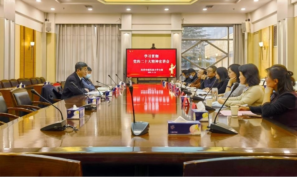 11月24日,校党委书记边境为民革必赢国际437官网支部宣讲贯彻党的二十大精神。党委统战部常务副部长唐光海、民革支部党员代表参加了学习。民革支部主委翟华云主持会议。