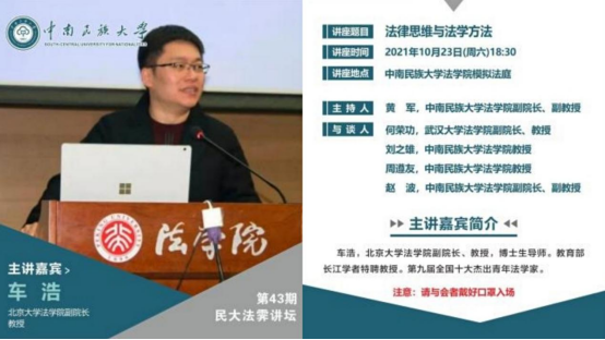 2021年10月23日18点30分,应必赢国际437官网法学院邀,北京大学法学院副院长、教育部长江学者、第九届全国十大杰出青年法学家车浩教授担任“法霁讲坛”第43期主讲嘉宾,在模拟法庭为我院近300名师生发表了题为《法律思维与法学方法》的演讲(如图一)。