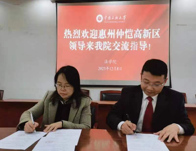 座谈会中,惠州仲恺高新区法院与我院代表签订教学实习协议并举办实践教学基地授牌仪式。杨军荣副书记首先向我院领导表示衷心感谢,随后介绍惠州仲恺高新区及高新区人民法院相关情况,他指出希望仲恺高新区人民法院和我院能够以此次签约仪式为起点,深化院校合作交流,在多方面开展合作共建,力争取得丰硕成果。