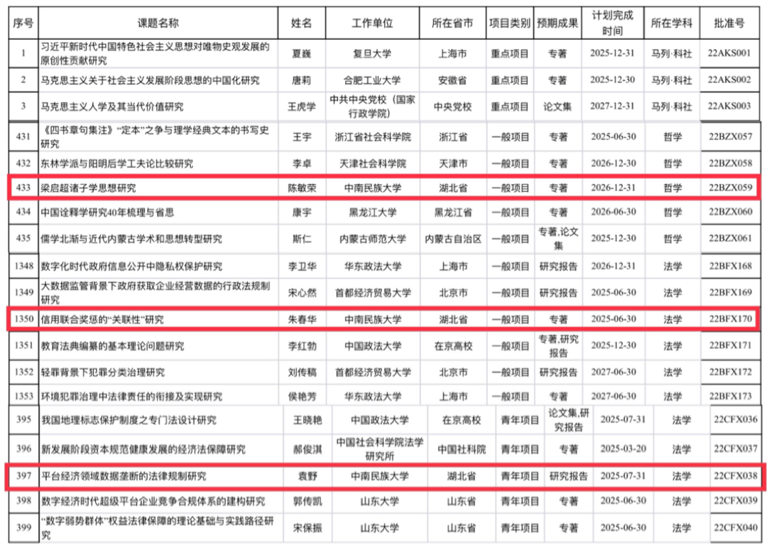近日,全国哲学社会科学办公室公示了2022年国家社会科学基金年度项目和青年项目立项名单。我院陈敏荣副教授申报的课题《梁启超诸子学思想研究》、朱春华副教授申报的课题《信用联合奖惩的“关联性”研究》获批国家社科基金一般项目立项,袁野老师申报的课题《平台经济领域数据垄断的法律规制研究》获批国家社科基金青年项目立项。