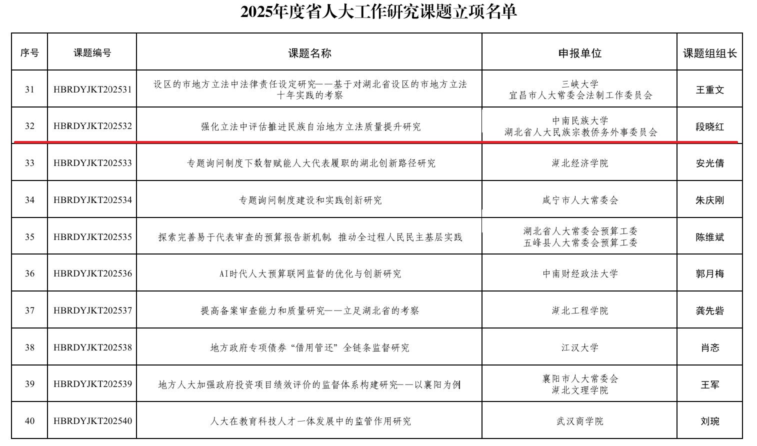 近日,湖北省人大下达了2025年度省人大工作研究课题立项项目的通知,我院段晓红教授申报的课题《强化立法中评估推进民族自治地方立法质量提升研究》获批立项。