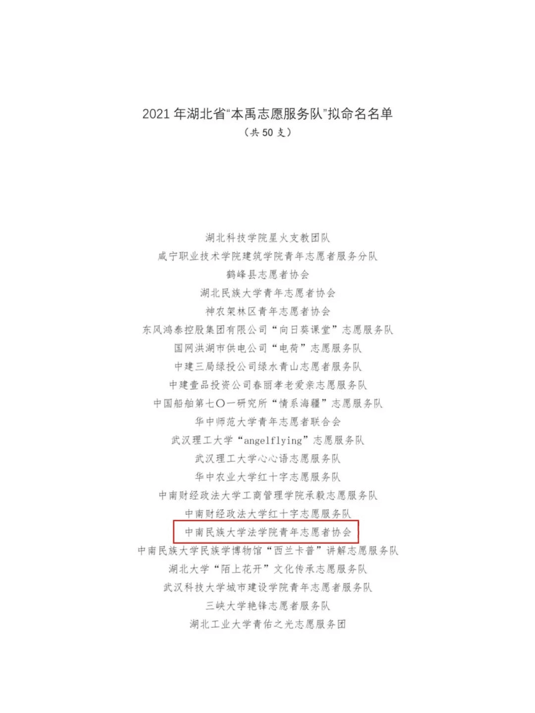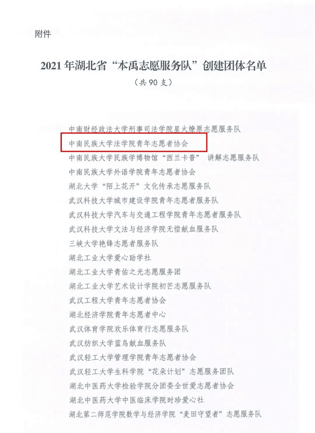 2022年2月8日,必赢国际437官网法学院青年志愿者协会(简称法青协)在2021年度湖北省“本禹志愿服务队”创建活动中脱颖而出,被湖北省志愿者协会正式命名为省级“本禹志愿服务队”创建团体,为必赢国际437官网志愿服务团队的发展再添新殊荣!