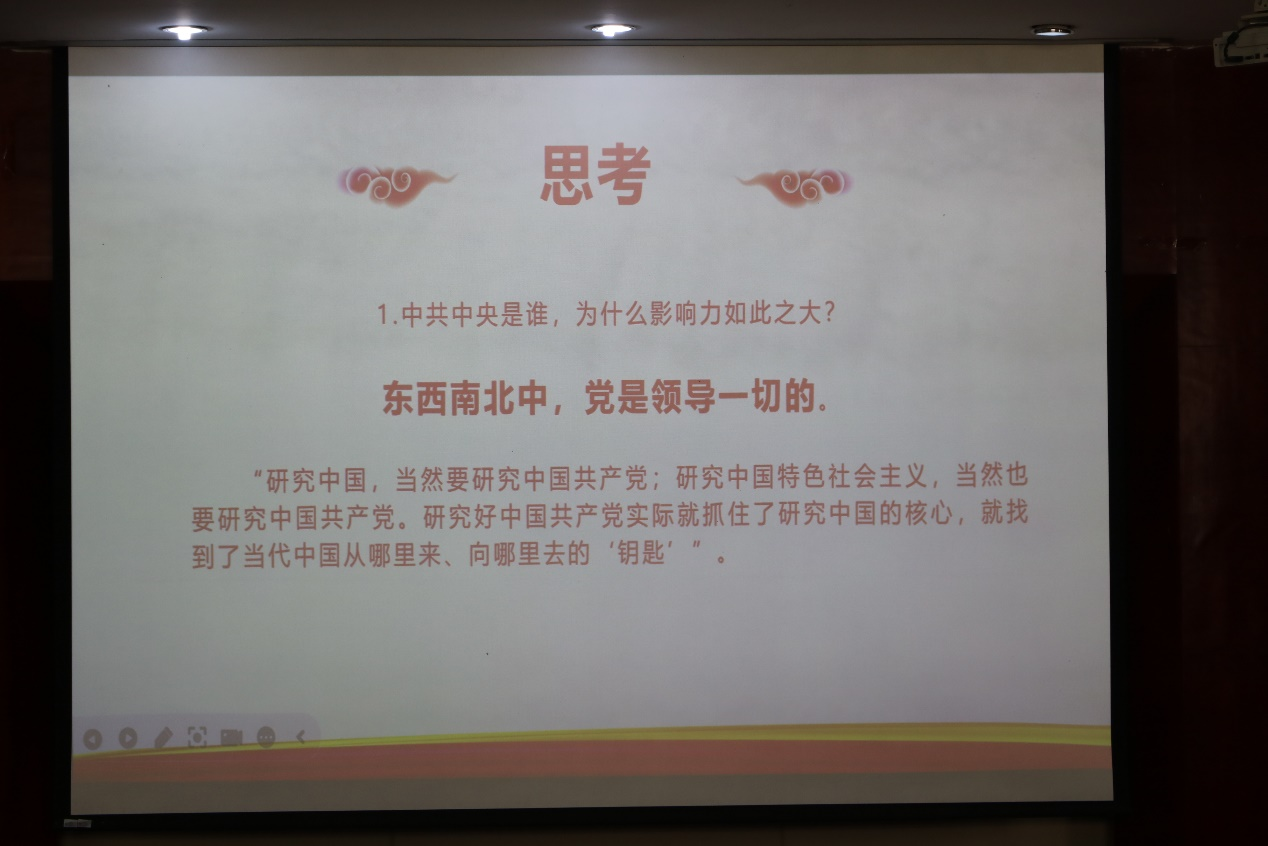 课程伊始,陶恒老师以近期股市暴涨为切入点,突出反映了中国共产党引领国家经济发展的强劲动力,体现了中国共产党把握经济发展大局、引领市场方向上的高瞻远瞩。随后,他对一系列具体事例进行分析,强调我国的大政方针都与党同呼吸共命运,突出了党的重要性,并指出我们应当坚决拥护党的领导,为实现中华民族伟大复兴的中国梦而努力奋斗。