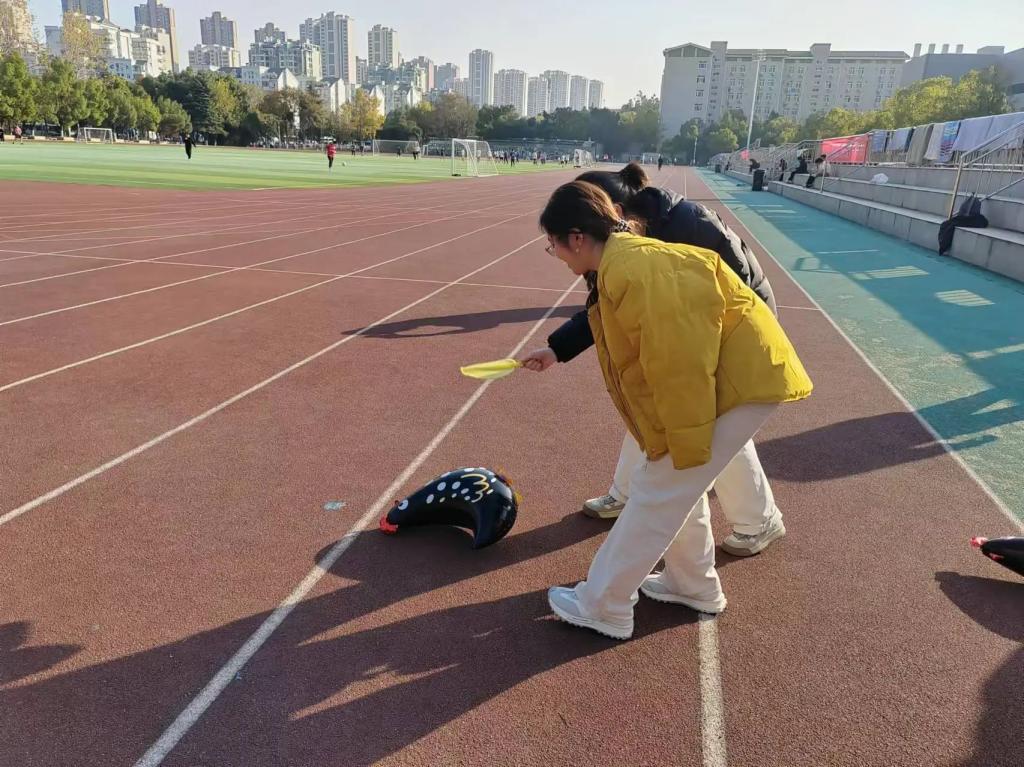 第四个环节为“趣味赶动物”。每个班级派出四位代表从起点出发,每班有两把蒲扇作为道具。哨声响起之后四位代表接力用蒲扇将3个动物气球是“扇”到指定位置。用蒲扇扇动气球,象征着各民族同学携手共进,共同前行。