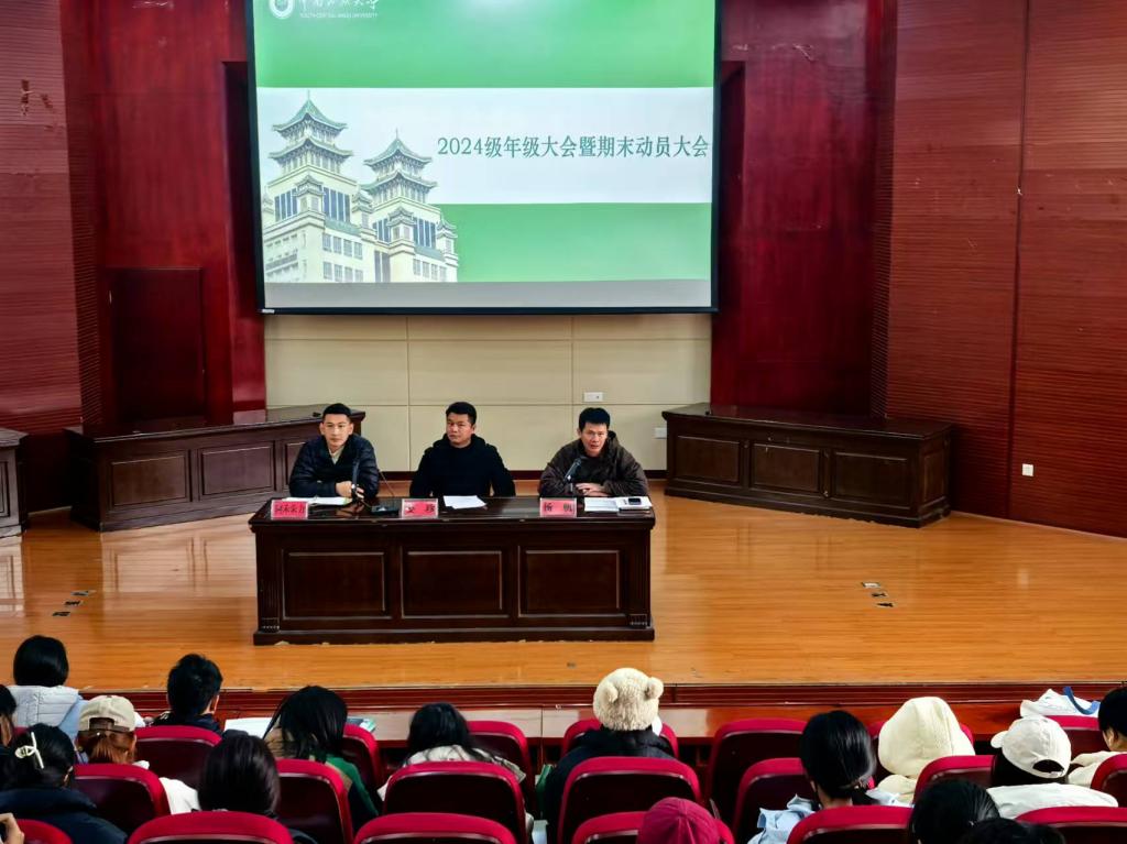 12月20日下午15时,2024级年级大会暨期末动员大会在学院模拟法庭顺利举行,此次会议由24级辅导员阿禾朱力·黑沙老师主持,姜珍副书记及杨帆副院长出席并发表讲话,欢迎即将转专业到来的同学们,并为法学专业学生的期末学习工作与成长规划指明方向。