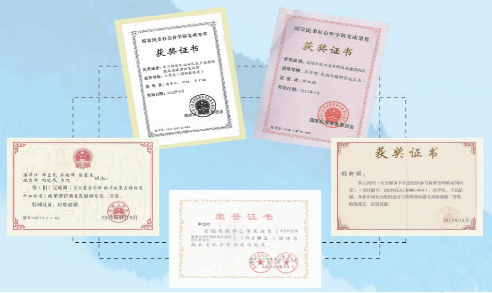 经过多年的建设,中心形成了民族地区基层治理、民族地区乡村振兴、民族地区乡村规划与旅游发展等稳定的研究方向,在科学研究、资政服务及人才培养方面取得了较好的成绩:获批国家及省部级项目20多项,获得湖北省、国家民委等省部级以上科研奖励及领导肯定性批示20次(项),完成民族地区“十四五规划”、乡村振兴规划及旅游规划等30多项,培养硕博研究生21名。