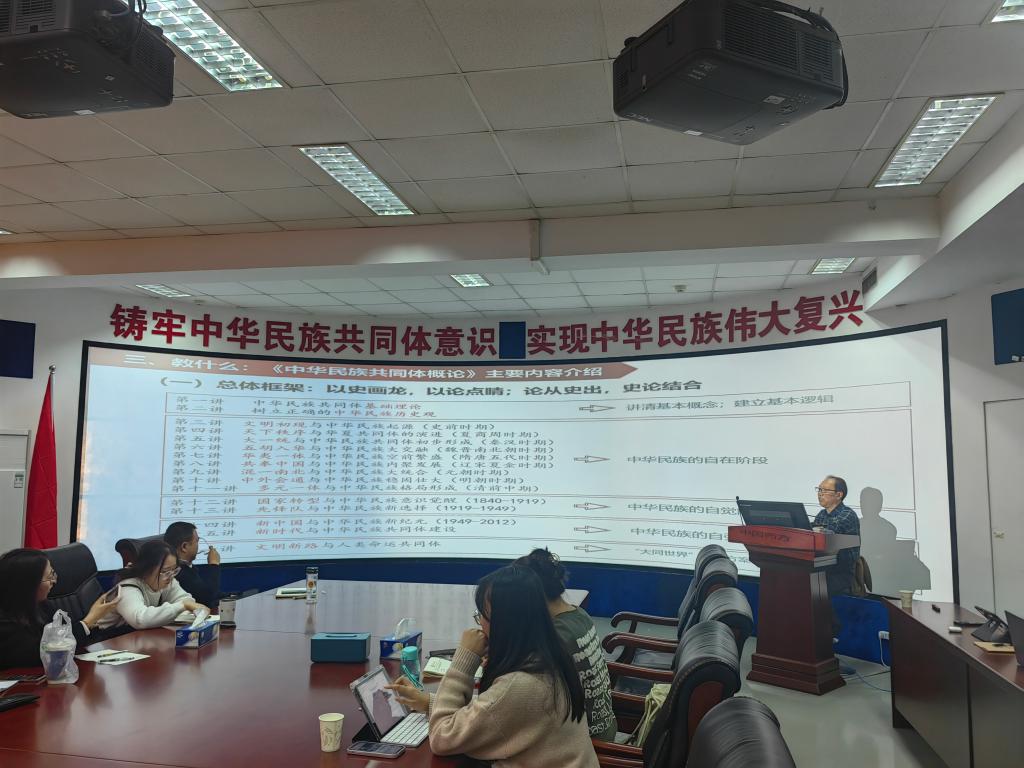 11月23日下午,中华民族共同体学院(研究院)姚上海教授以“慧眼看中华,概论话铸牢”为主题,以课程逻辑与结构体系为脉络,为中华民族共同体学院师生倾情讲授《中华民族共同体概论(试用本)》(以下简称《概论》),本次会议由学院党总支书记贺展主持。
