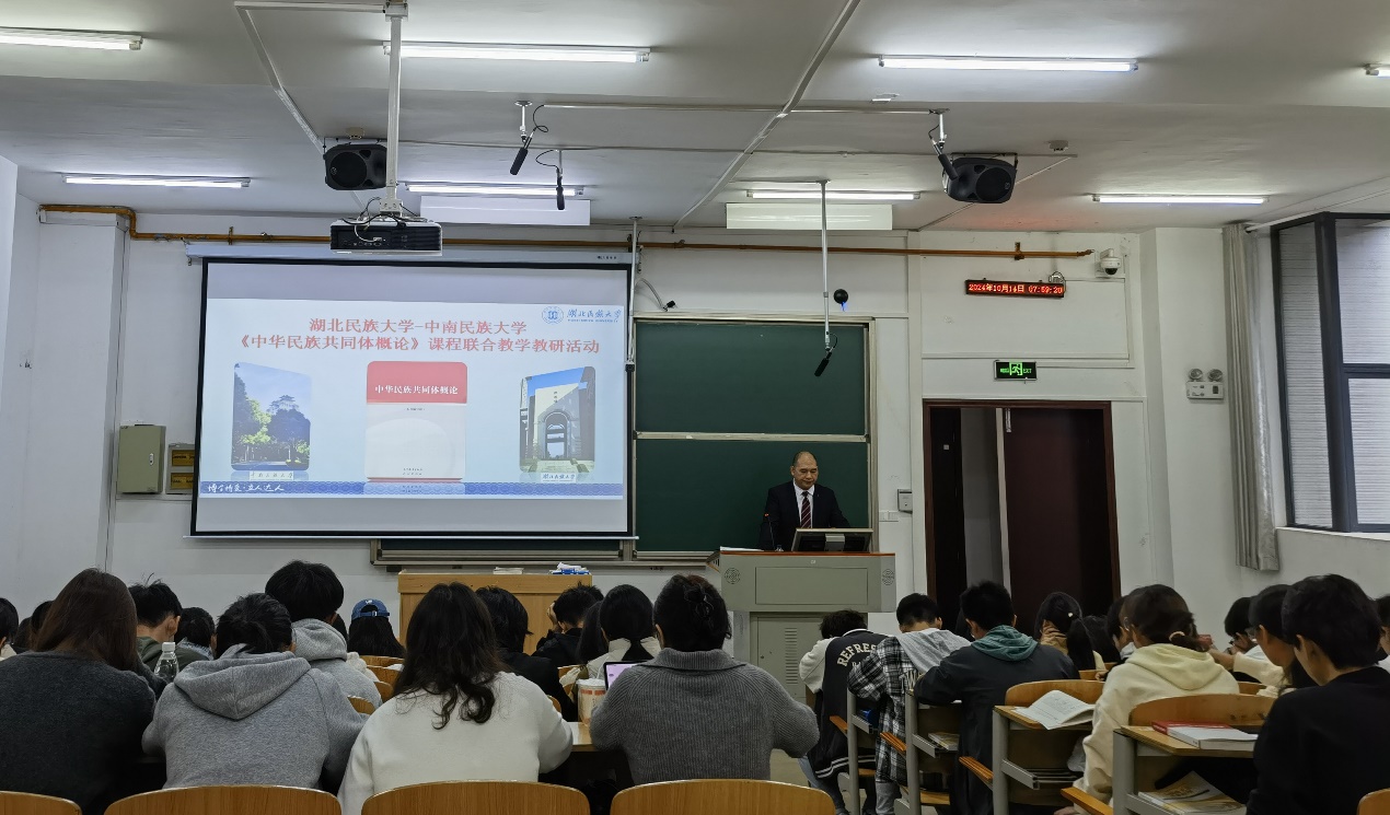 为深入学习贯彻习近平总书记在全国民族团结进步表彰大会上的重要讲话精神,推动中南片区中华民族共同体概论课程建设联盟和虚拟教研室发展,10月14日,我院中华民族共同体概论教研室主任裴圣愚带队赴湖北民族大学开展“共读教材悟铸牢”联合教学教研活动。我院概论课教师代表赵梦涵、部分学生代表参加活动。本次活动分为课堂教学交流和主题教研两个环节。