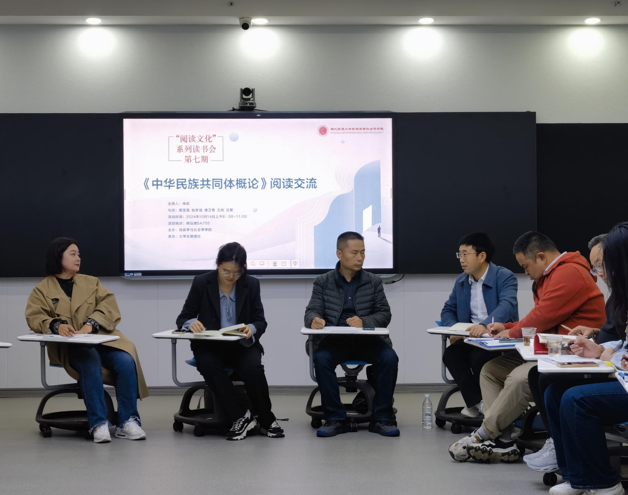 湖北民族大学民族学与社会学学院(中华民族共同体学院)院长杨洪林、副书记申莉、副院长唐卫青、教研室主任王剑,以及教师代表和硕士生参加主题教研暨“阅读文化”系列读书会。裴圣愚、赵梦涵介绍了概论课教学和建设有关情况,并分享了《概论》教材的阅读学习体会。