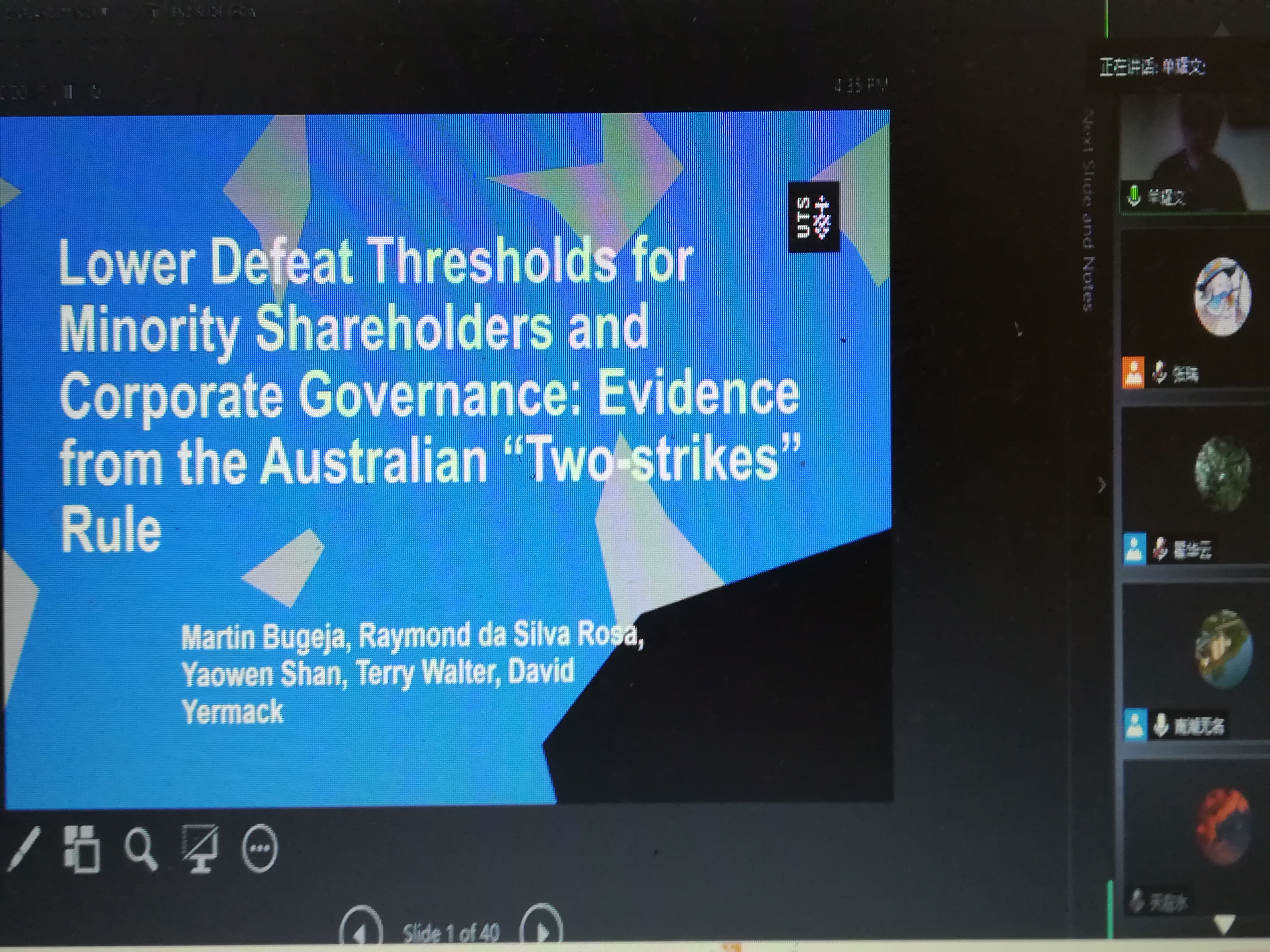2020年7月17日下午,应高校风险预警防控中心邀请,Australian Journal of Management(SSCI)杂志副主编、悉尼科技大学商学院单耀文副教授通过视频会议为高校风险预警防控中心做了主题为“Lower Defeat Thresholds for Minority Shareholders and Corporate Governance: Evidence from the Australian Two-strikes Rule”的学术讲座。讲座由管理学院院长、张劲松教授和副院长、翟华云教授主持,高校风险预警防控中心的研究成员和管理学院研究生共40余人在线收听和学习。