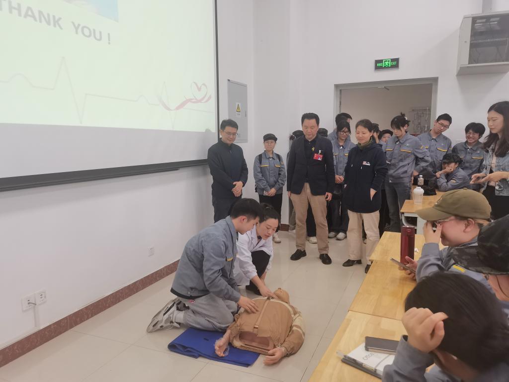 上午11时10分,演习开始,首先进行了医疗应急处置教学讲解环节。杨冰医师讲解了醉酒急救、应急包扎、心肺复苏等突发情况的急救知识、急救要点和步骤、操作过程中的注意事项等。在初步的急救理论知识讲解之后,徐佳妮医师利用模拟人给大家做心肺复苏现场示范,并邀请现场的师生现场参与操作。老师和同学们饶有兴趣地依次上前体验心肺复苏术。