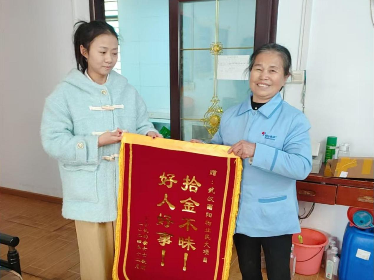 2024年12月21日,西区保洁员何玉平在天桥下拾获装有苹果手机与学生卡的手提包,通过学工部联系焦急的学生物归原主,获赠锦旗致谢。