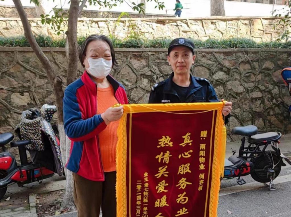 2024年3月21日中午,西区秩序员何齐明敏锐察觉22栋1单元地下室杂物间烟雾弥漫,火情初现。他迅速上报,为消防部门及时扑救赢得关键时间,有效避免重大损失,业主特赠锦旗以表感激。