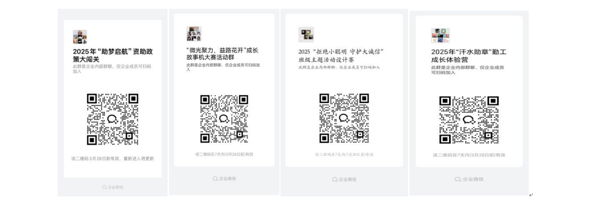 自主报名学生加入企业微信群,填写报名表即可。各学院要在获得过国家奖助学金、学校暖心帮扶、各类社会资助的学生及享受过基层就业或参军入伍代偿政策福利的学生中积极宣传、广泛动员,3月27日17:00前至少推荐5名在校生参赛,将《“助梦启航”资助政策大闯关推荐表》(附件1)发送至邮箱:xszz@scuec.edu.cn,并通知参赛学生扫码加入企业微信群(群二维码附后)。