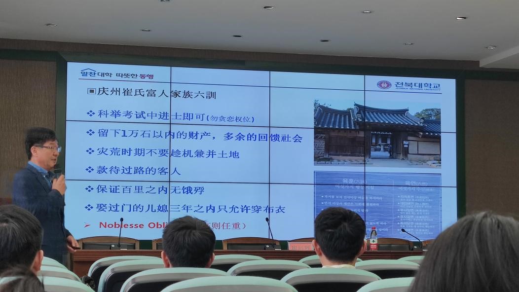 In a move to promote academic exchange and broaden global perspectives, the School of Economics welcomed Professor Choi Baek Ryul, Vice President of Chonbuk National University, for an insightful lecture on March 22nd. The lecture, titled “CSR, CSV, ESG”, was chaired by Meng Qinglei and attended by faculty representatives and graduate students.