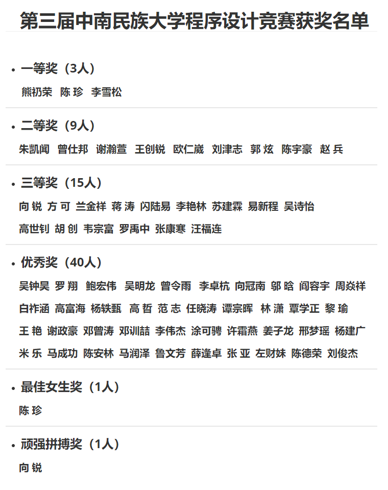本次竞赛熊礽荣、陈珍、李雪松获得一等奖,朱凯闻、曾仕邦、谢瀚萱等9位同学获得二等奖,向锐、方可、兰金祥等15位同学获得三等奖,获奖占比约59%。刘卫平老师为以上获奖人员颁发获奖证书及奖品,最后,全体获奖人员拍照合影。