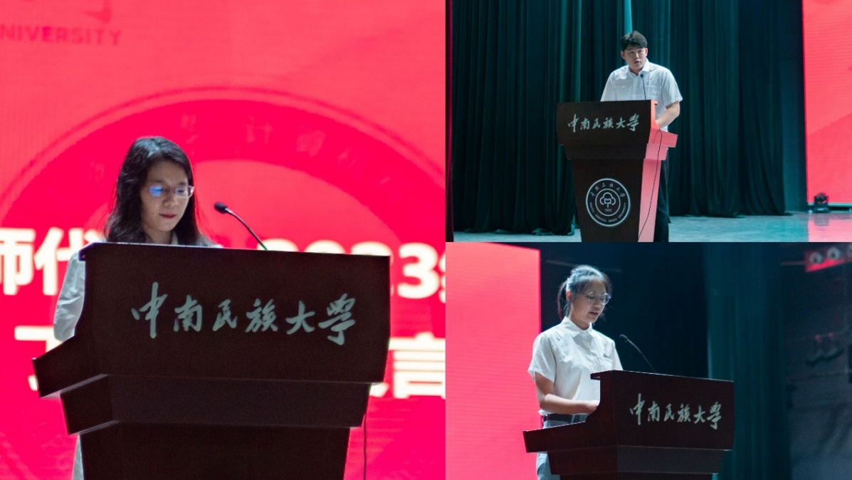 教师代表丁凤老师、2020级学生代表郑卓然同学、2023级新生代表刘好同学作发言