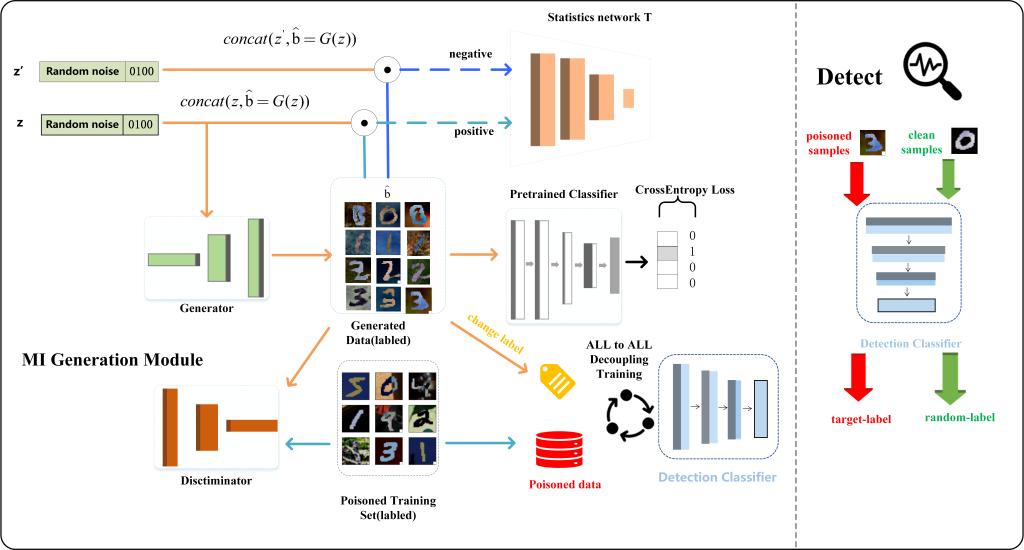 为了解决上述问题,该论文提出了一种不使用干净数据集的多域主动防御方法。所提出的方法可以生成不同域的干净样本,并利用干净样本逐轮解耦神经网络,从而解除特征和标签之间的关联,使后门中毒样本更容易被检测。