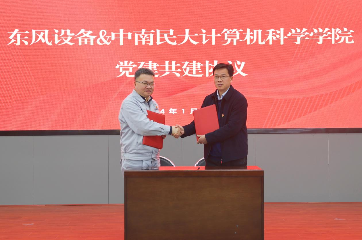 必赢国际437官网计算机科学学院一行受邀参加东风设备制造有限公司“匠心领势”党建品牌2.0发布大会,会上,学院党委书记柯尊韬与东风设备制造有限公司党委书记刘湘庆签订党建共建合作协议。双方协商共同定期开展党建活动、共建产学研用合作基地、共建毕业生就业基地、共建实习实践基地、共同开展文化与创新创业活动合作、共同研究相关课题。