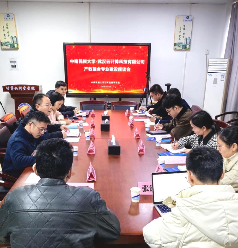 11月26日,武汉云计算科技有限公司来学院开展产教融合专业建设座谈交流。武汉云数字运营中心总监史琳波、武汉云政企业务负责人陈冲、武汉云服务经理许明艳和陈继宽、产品经理罗彬、黄鹤实验室工程师张钦澳,计算机科学学院院长帖军、副院长田微、孙阳光和张潇、网络工程系党支部书记朱剑林、系主任和专业负责人王俊、系教师代表熊伟和杨波参加本次座谈。
